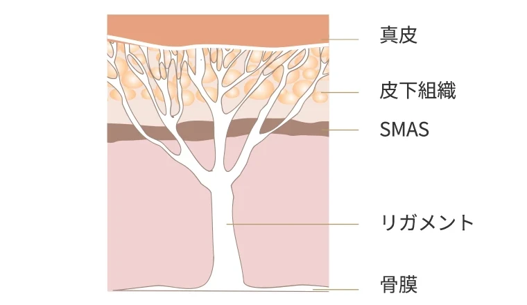 私たちの顔には、皮膚や脂肪を骨にしっかり固定する「リガメント(支持靭帯)」という組織が存在します。このリガメントが、年齢とともに伸びたり緩んだりすることで、顔全体が本来の位置から下がり、たるみが進行してしまうのです。