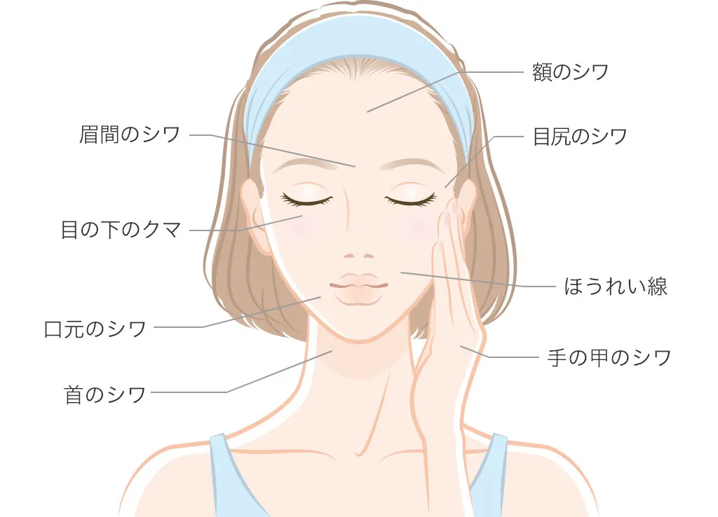 シワやたるみは加齢や紫外線ダメージによって肌の真皮層にある「エラスチン」が減少・変性し弾力が低下するために生じます。