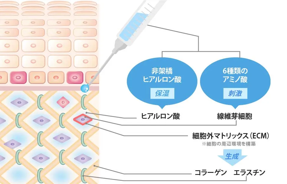 スネコスは非架橋のヒアルロン酸と6種類のアミノ酸が国際特許取得の特別な比率でブレンドされた製剤で、注入することで美肌の基礎を支えるコラーゲン、エラスチン、ヒアルロン酸などから構成される細胞外マトリックス(ECM)の再生と機能改善を促し、肌自体の再生・ハリ・弾力・ツヤの改善に高い効果を発揮します。