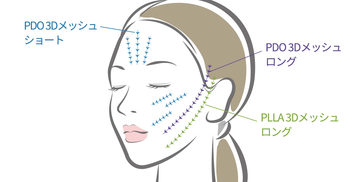 アルテミスリフトは、使用部位やニーズに応じて、素材および長さの異なる糸を挿入していくことで理想的なフェイスラインの形成を実現します。 当院ではPLLA 3D メッシュロング、PDO 3D メッシュショート及びロングの3種類の糸をご用意しており、患者様の肌状態やお顔の形状、ご希望に合わせて糸を組み合わせながら、理想的なフェイスラインを形成していきます。