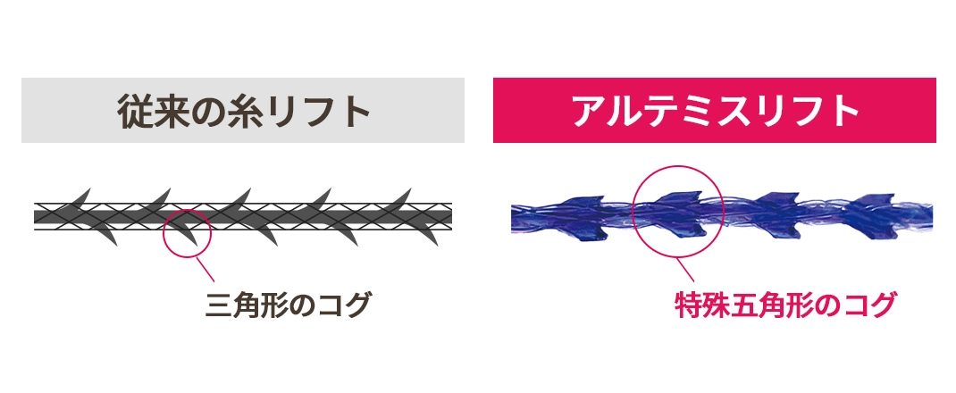 アルテミスリフトは、特殊五角形のモルディング式のコグがあり、一つ一つのコグが独立構造を持つため、強度が高く強力なリフティング効果が期待できます。また、挿入時の組織損傷を最小限にし、施術後に感じるチクチクした痛みを軽減します。
