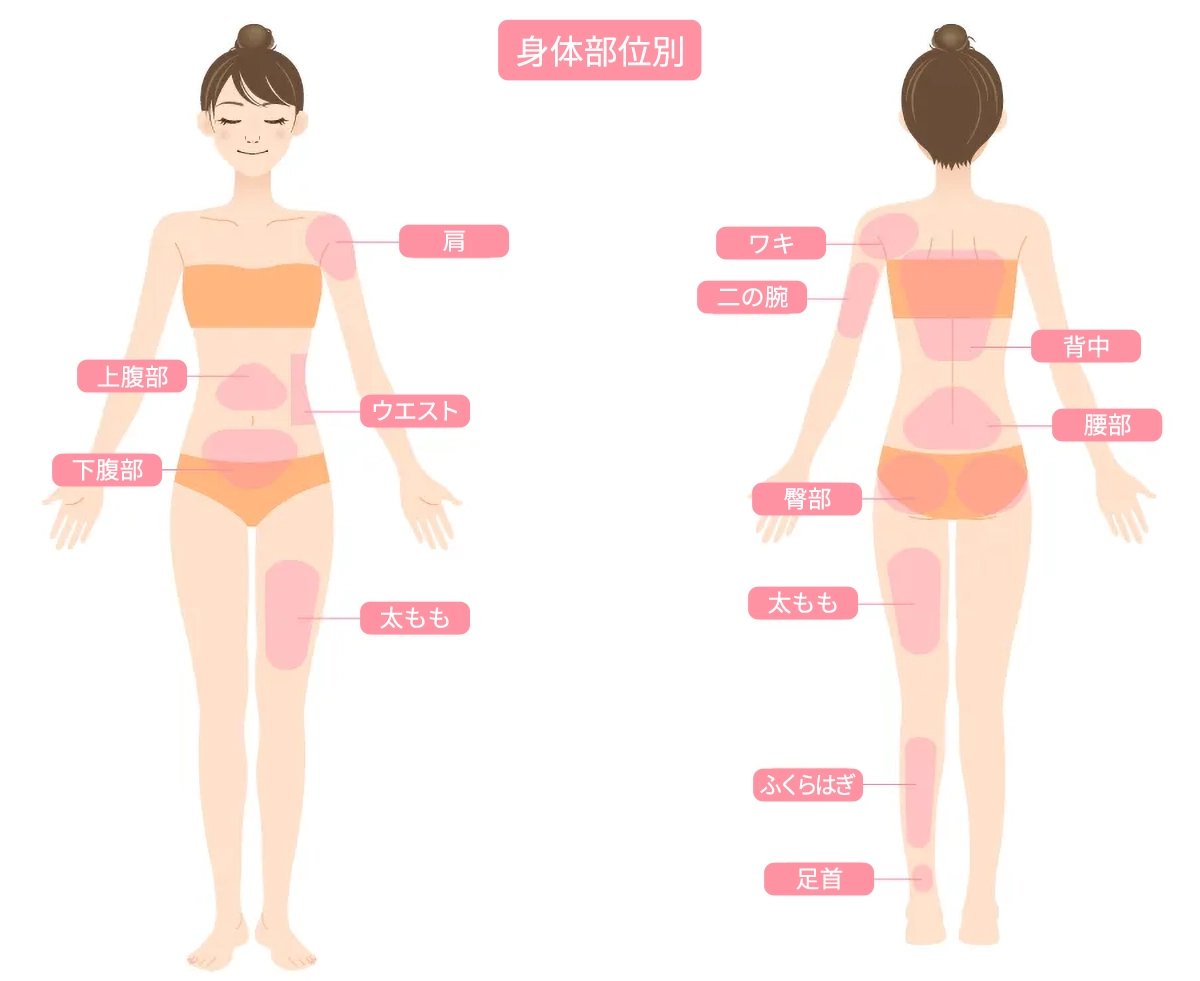 対応可能な部位は、肩・脇・背中・上腹部・下腹部・ウエスト・腰・お尻・太もも・ふくらはぎ・足首など。